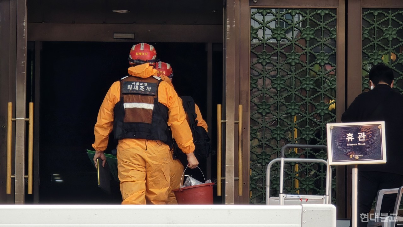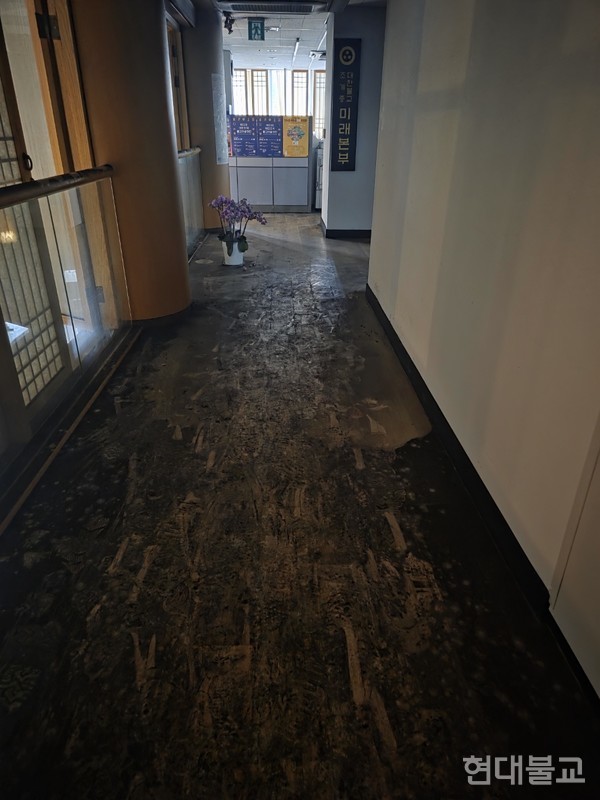 기획실장 법오 스님은 기자들에게 화재가 발생한 국제회의장 입구와 청사 2층 사무실 등 일부 공간을 안내하며 피해 당시 상황을 설명했다. 불길이 시작된 국제회의장 천장은 전소돼 골재가 그대로 드러났다. 바닥에는 검은 분진과 깨진 유리, 건물 잔해가 쌓여 있고 곳곳에 소방수가 고여 있었다. 방진 마스크를 착용했지만 매운 냄새와 연기로 숨쉬기가 힘들었다.