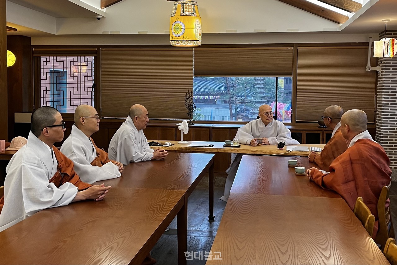 장명 스님이 “원로 법등 큰스님이 화재 복구를 위해 빠르게 움직일 것을 당부했다”고 하자 진우 스님은 “본사 살림이 팍팍한데 성금을 내줘 감사하고 미안하다”고 고마움을 표했다.