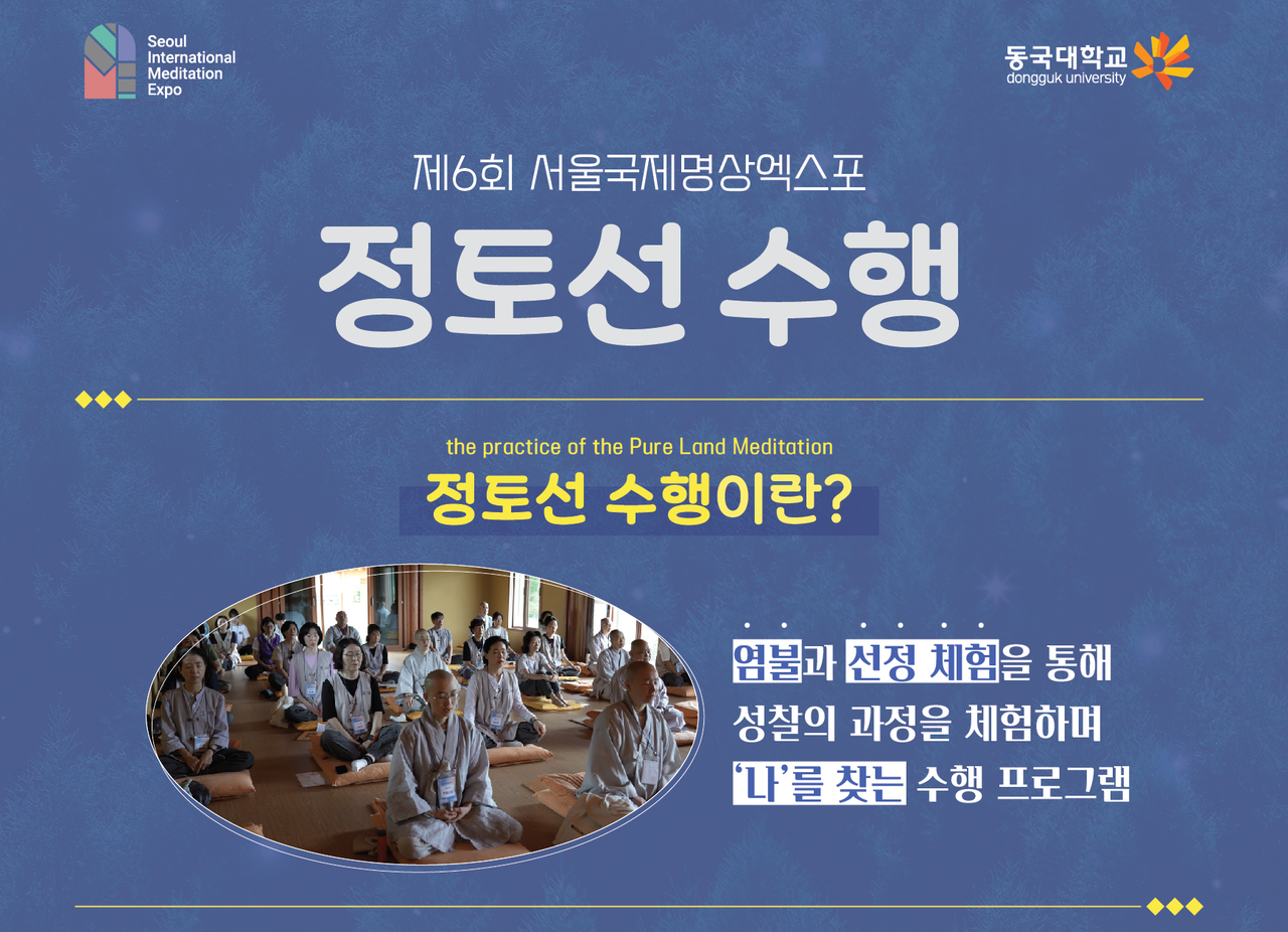 제6회 서울국제명상엑스포의 주요 행사인 ‘정토선 수행체험 프로그램’은 염불과 선을 겸수(兼修)함으로써, 수행자 스스로 내면을 성찰하고 ‘진정한 나’를 찾아가는 여정으로 구성되어 있다. 참가자들은 부처님의 명호(名號)를 염송하며 본성의 소리를 돌이켜 듣는 ‘반문문성(反聞聞性)’ 수행을 통해 자연스럽게 마음속에서 염불을 이해하고, 이를 바탕으로 마음을 밝히고 성품을 보는 ‘명심견성(明心見性)’의 경지에 이르는 체험을 하게 된다.