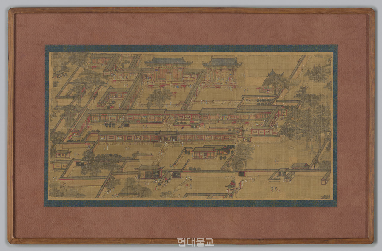 이 작품은 궁궐의 모습을 부감법으로 그린 궁궐도의 일부였을 것으로 추정된다. 그림 상단 중심부에는 청기와를 얹고 추녀마루를 잡상(雜像)으로 장식한 정면 5칸의 불전(佛殿)이 자리 잡고 있다. 조선 전기에 청기와의 주원료인 염초는 국가에서 관리하는 군수물자였다. 이 때문에 청기와의 원료 수급과 제조는 원활하지 못했다. 그 결과 청기와는 궁궐의 중요한 전각이나 왕실의 원찰, 중국과 관련이 깊은 건축물 등에 극히 제한적으로 사용됐다. 이로 보아 청기와로 이은 그림 속의 불전은 왕실의 후원을 받은 사찰, 나아가 궁궐 내에 건립된 내불당일 가능성이 있다.