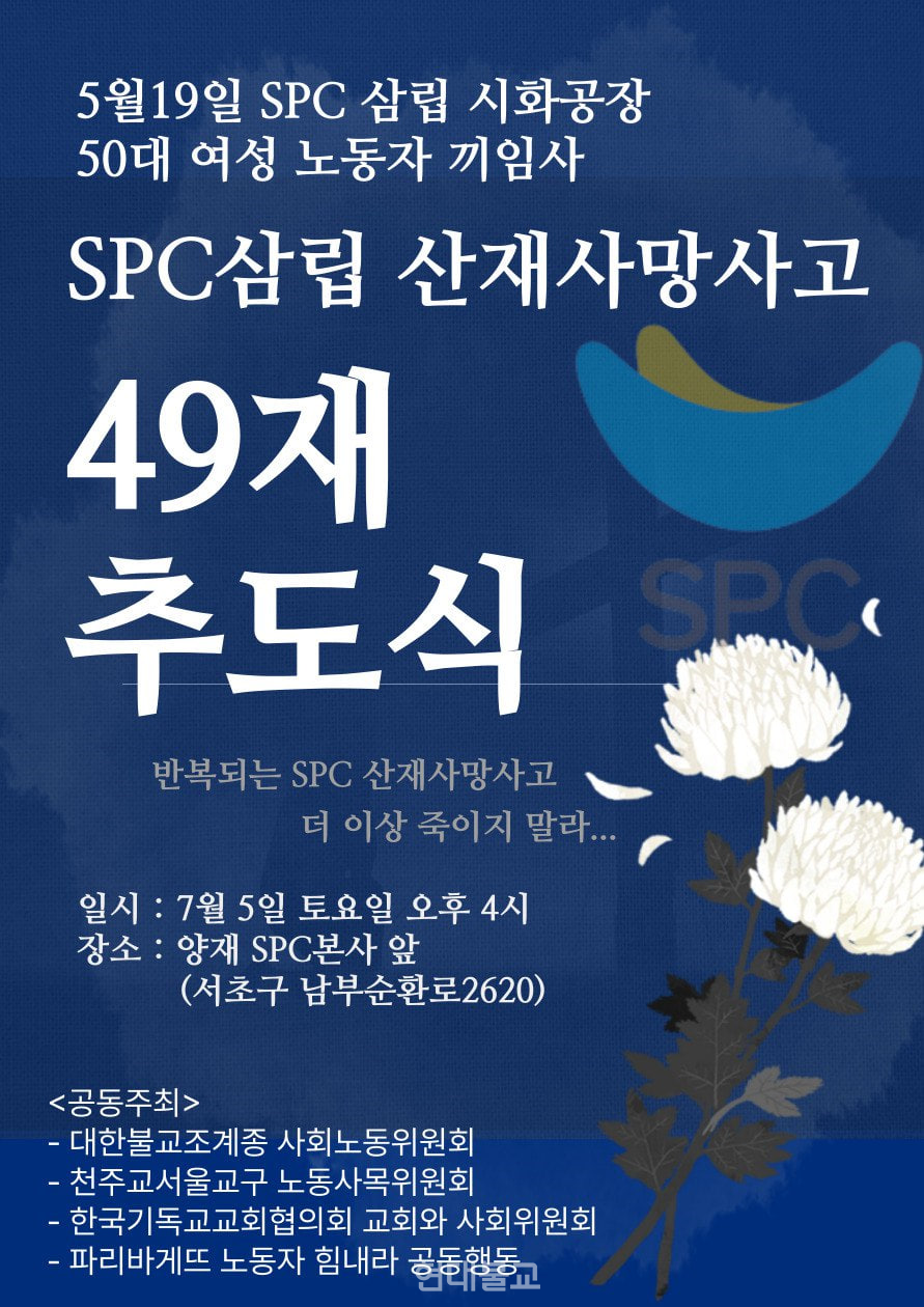 지난 5월 19일 SPC삼립 시흥 제빵공장에서 컨베이어 벨트 수동 작업 중 사망한 50대 여성노동자 양 모씨의 49재 추모기도회가 봉행된다.