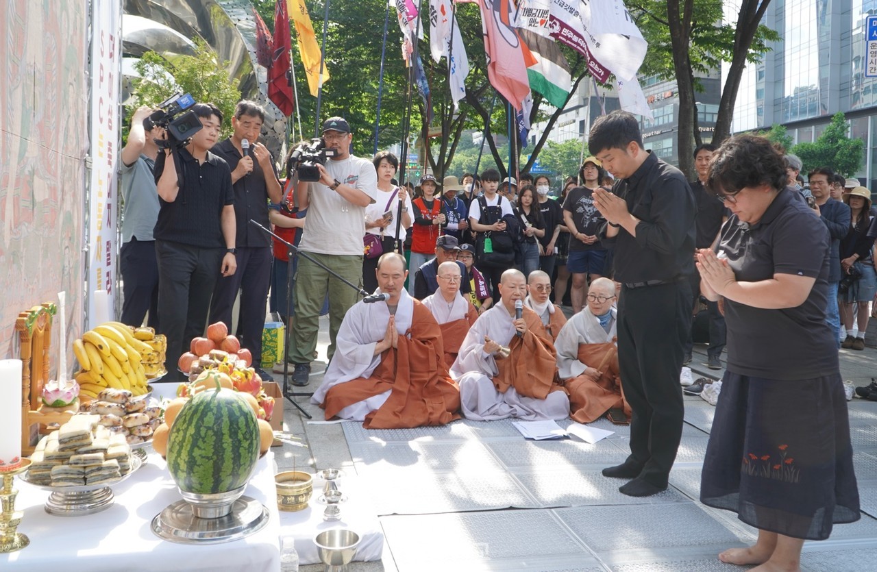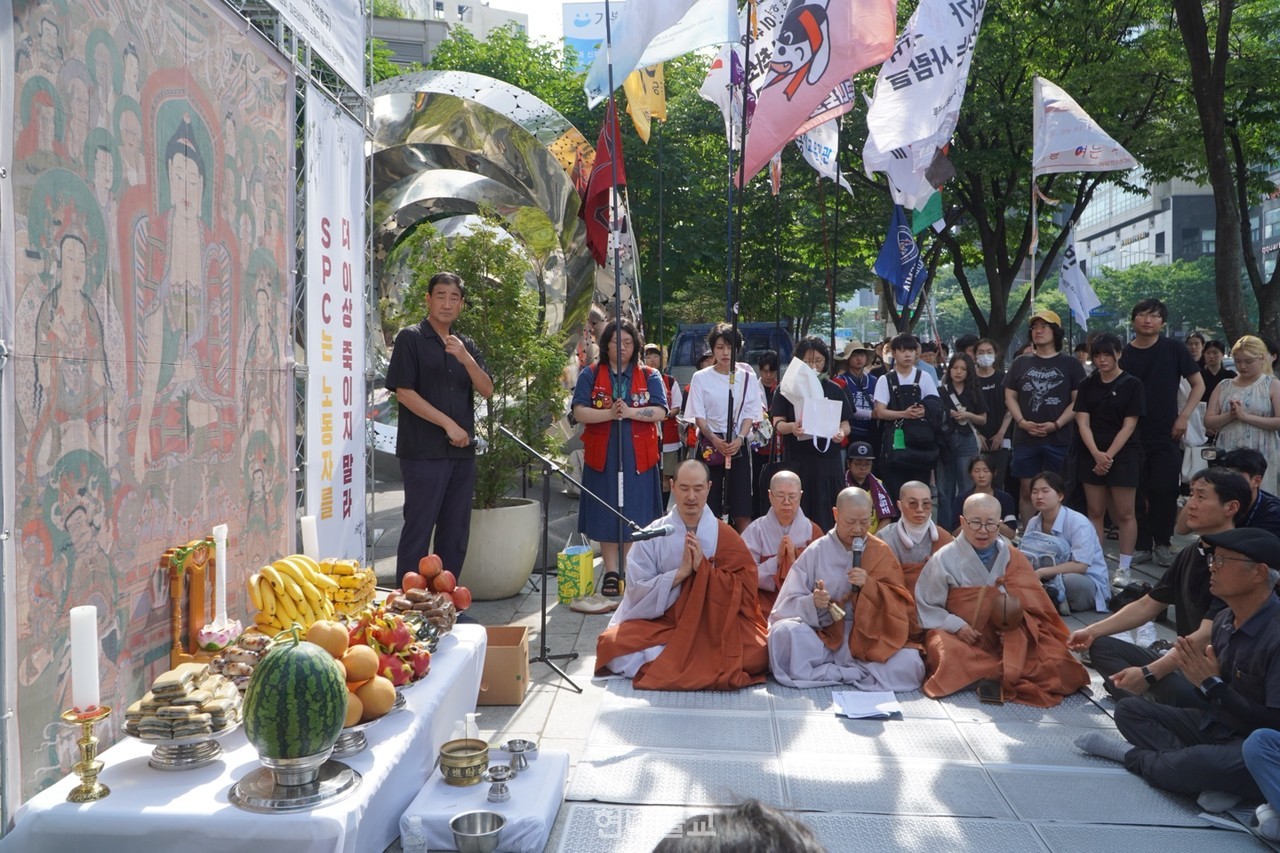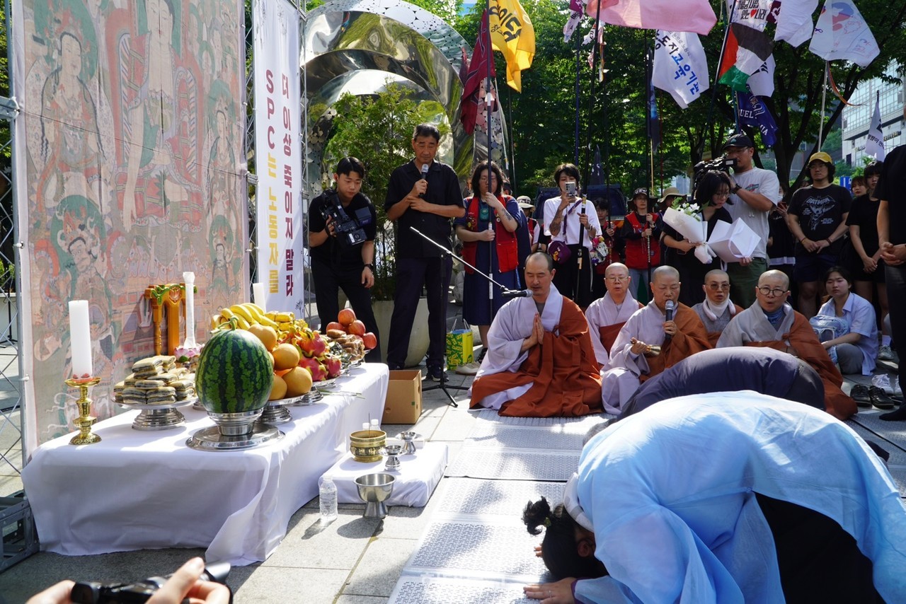 조계종 사회노동위원회(위원장 지몽 스님, 이하 사노위)는 7월 5일 서울 SPC본사 앞에서 ‘SPC삼립 산재 사망사고 49재 추도재’를 봉행했다. 이날 49재는 조계종 사회노동위, 천주교서울대교구 노동사목위원회, 한국기독교교회협의회 교회와 사회위원회의 3대 종교계와 파리바게뜨 노동자 힘내라 공동행동을 비롯한 시민들이 함께했다.