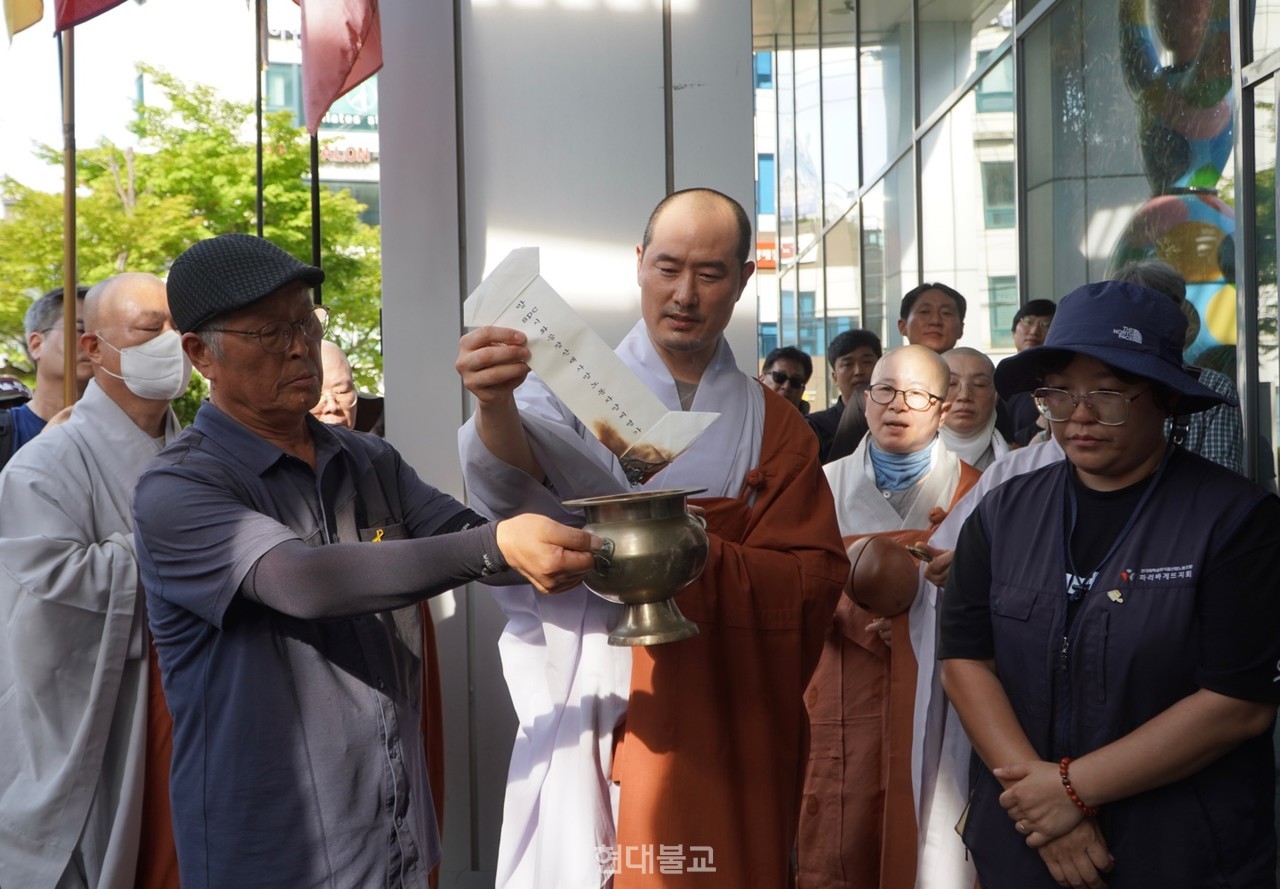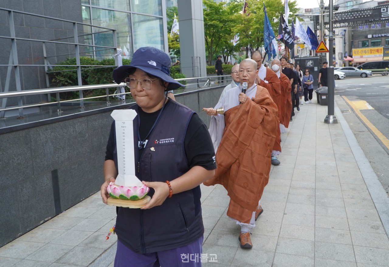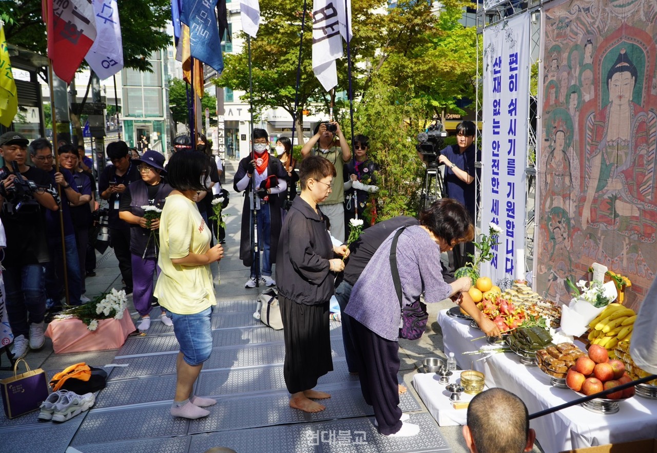 조계종 사회노동위원회(위원장 지몽 스님, 이하 사노위)는 7월 5일 서울 SPC본사 앞에서 ‘SPC삼립 산재 사망사고 49재 추도재’를 봉행했다. 이날 49재는 조계종 사회노동위, 천주교서울대교구 노동사목위원회, 한국기독교교회협의회 교회와 사회위원회의 3대 종교계와 파리바게뜨 노동자 힘내라 공동행동을 비롯한 시민들이 함께했다.