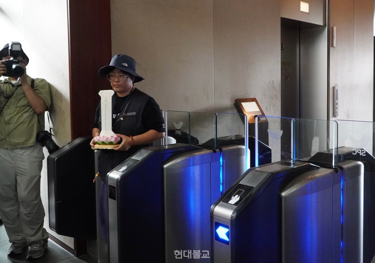 이날 추모기도는 추모사, 천도기도, 추모발언, 위패소지 순으로 진행됐다. 기도와 발언 후 동참자들은 고인의 위패를 들고 SPC 본사 건물을 한 바퀴 돌았다. 정문 앞에 모두 모인 동참자들은 노래 ‘다시 만난 세계’를 열창 한 후 위패를 소지하며 추모재를 마무리 했다.