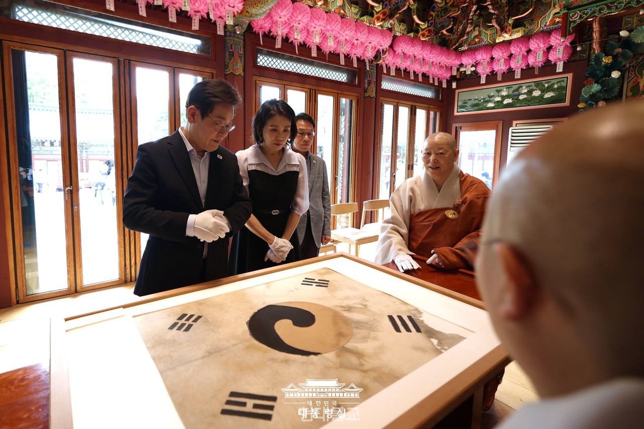 이재명 대통령이 8월 17일 서울 진관사를 방문해 “서로 갈라져 상처 입은 국민들을 잘 보듬고 끌어안아야 한다”고 말했다.