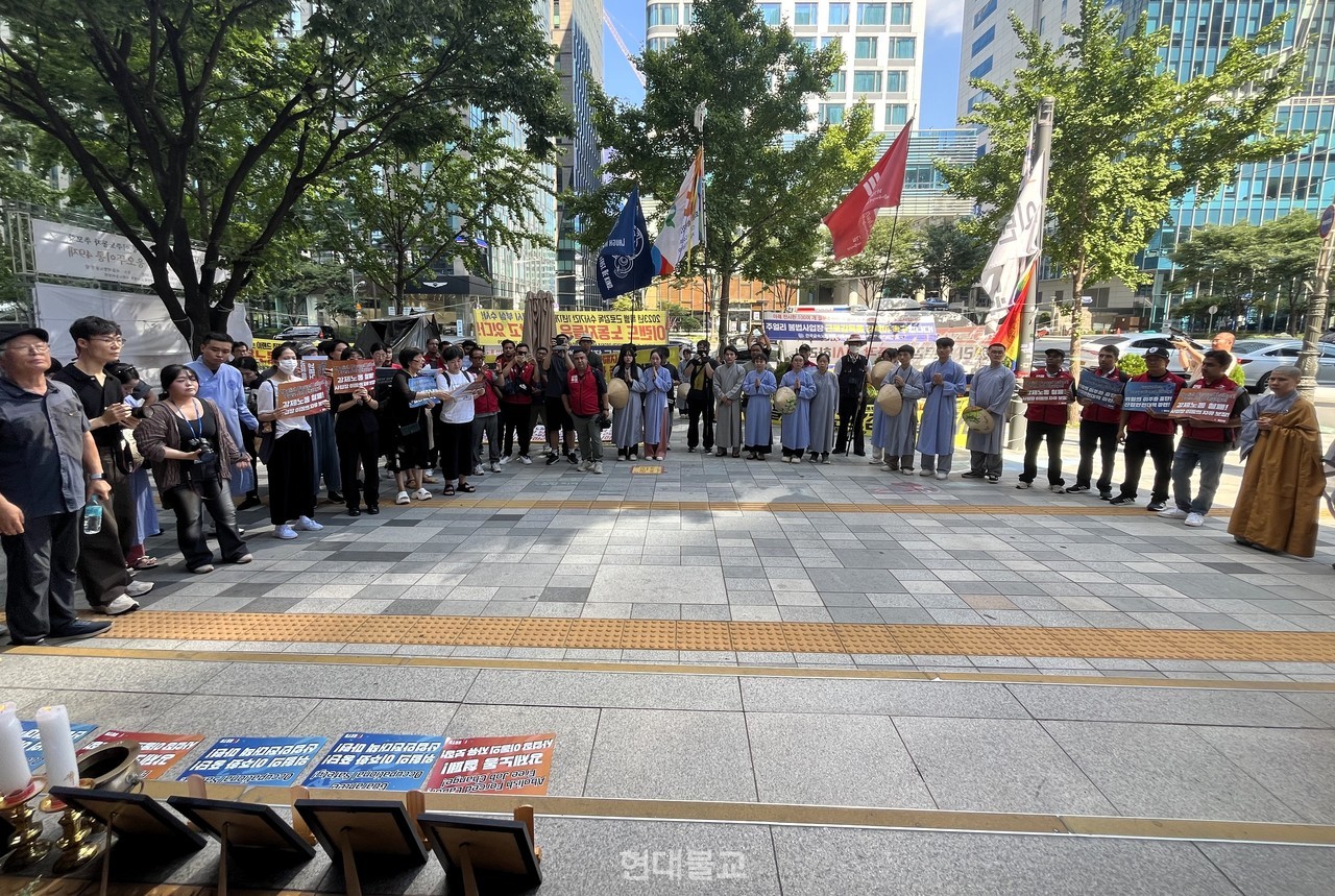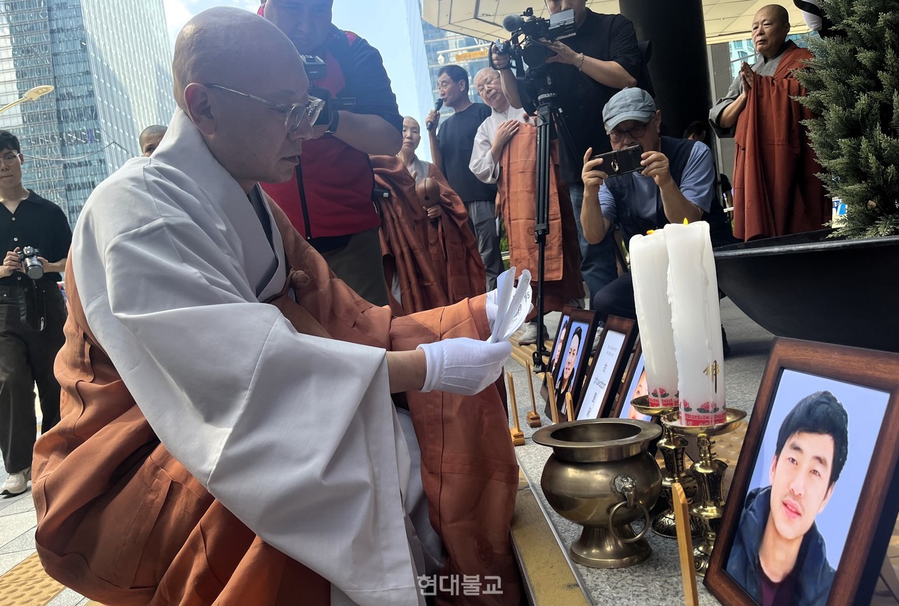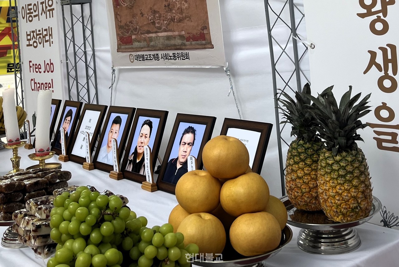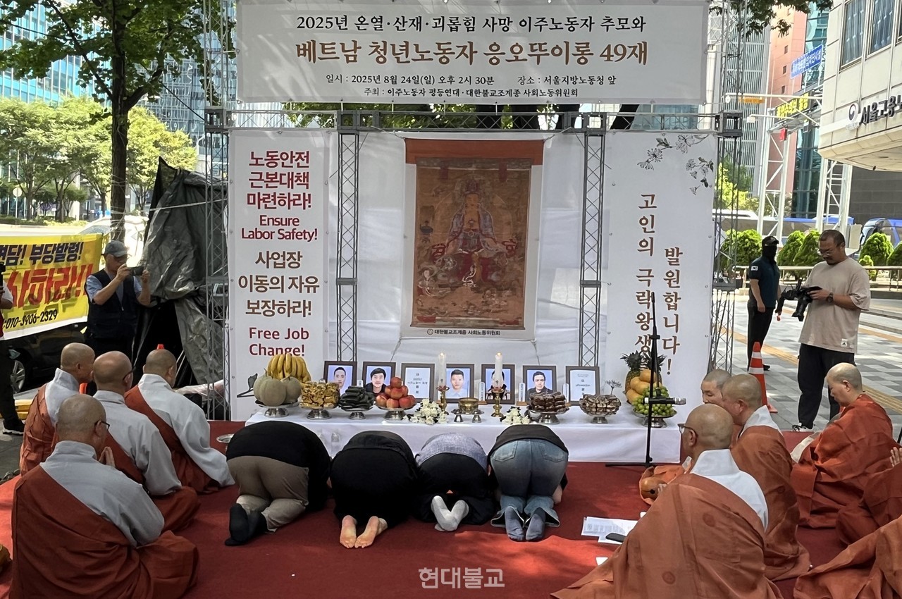 조계종 사회노동위원회(위원장 지몽 스님, 이하 사노위)가 8월 24일 서울고용노동청 본청 앞에서 베트남 출신 20대 청년 응오뚜이롱의 49재 및 산재로 떠난 이주노동자들을 위한 추모재를 봉행하고, 모든 영가들이 안전하고 차별없는 행복한 세상에 태어나 못다 이룬 꿈을 이루길 발원했다.