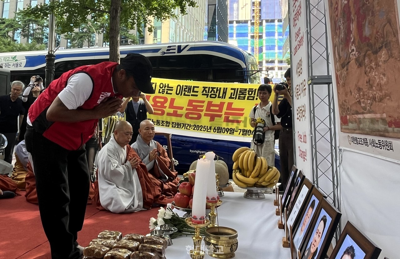 49재 및 추모재는 추모사, 스님들의 천도의식, 참가자 헌다·헌향, 추모발언, 위패소지 등으로 진행됐다. 의식과 발언 후 동참자들은 고인의 위패를 들고 서울고용노동청 본청 앞을 두바퀴 돌았다. 이어 정문 앞에 모여 위패를 소지하고 노래 ‘다시 만난 세계’ 등을 열창하며 추모재를 마무리 했다.
