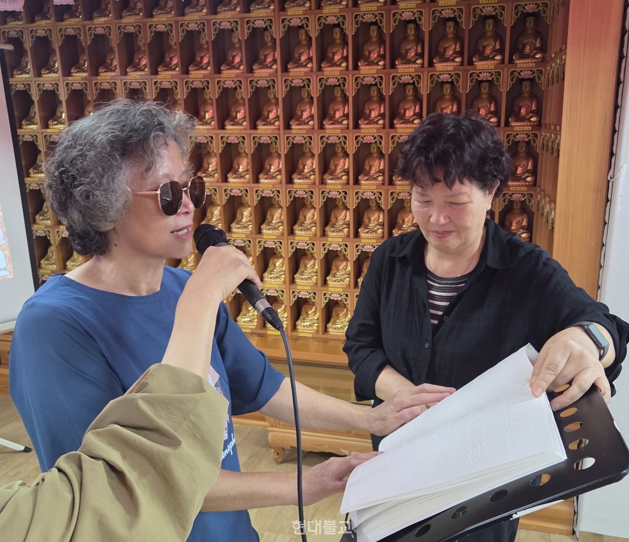 한 글자 한 글자 손으로 점자를 짚으며 나지막이 낭송하는 시(詩)가 법당을 가득 채운다. 사회복지법인 연화원(이사장 해성 스님, 광림사 주지)이 매달 한차례 봉행하는 수어법회가 9월 14일에는 시 낭송회로 진행됐다. 연화원 법사 법산 스님(전 조계종 법계위원장)이 최근 펴낸 시집 <나는 어디로 가나>의 점자판과 오디오북 발간을 축하하기 위한 자리다.