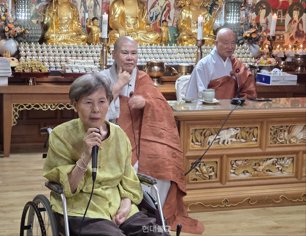 시 낭송 후 법문에 나선 법산 스님은 “설법은 여러분들이 다 하셨다. 여러분의 시력이나 청력은 잠시 멈춰 있지만 인식은 밝게 빛나 시 한 편으로도 다양한 감정과 깨달음을 느낄 수 있다. 감미롭고 감동적인 시 낭송에 감사드린다”고 말했다. 이어 “장애인 전법을 위해 애쓰는 해성 스님은 정말 위대한 일을 하고 계신 것”이라며 “우리가 함께 모여 불법과 마음을 나누는 이 자리가 곧 극락세계”라고 격려했다.