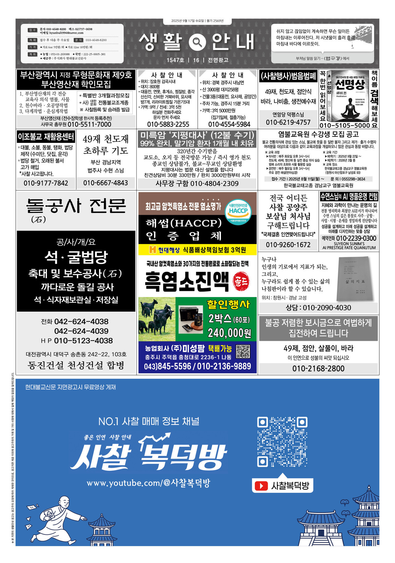 이전 기사보기 다음 기사보기 2025년 9월 둘째주 '금주의 불자정보 생활안내' 글자크기 설정 가 가 기사의 본문 내용은 이 글자크기로 변경됩니다. 스크롤 이동 상태바 생활안내 불자정보 2025년 9월 둘째주 '금주의 불자정보 생활안내' 현불뉴스 입력 2025.09.17 13:50 댓글 0 현불뉴스 hyunbulnews@hyunbul.com 다른기사 보기 저작권자 © 현대불교 무단전재 및 재배포, AI학습 및 활용 금지 개의 댓글 회원로그인 작성자 비밀번호 댓글 내용입력 댓글 정렬 최신순 추천순 답글순 BEST댓글 BEST 댓글 답글과 추천수를 합산하여 자동으로 노출됩니다. 닫기 더보기 댓글삭제 삭제한 댓글은 다시 복구할 수 없습니다. 그래도 삭제하시겠습니까? 비밀번호 댓글수정 댓글 수정은 작성 후 1분내에만 가능합니다. 본문 / 400 비밀번호 내 댓글 모음 닫기
