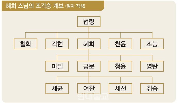 혜희 스님의 조각승 계보는 법령(1615~1641 활동)→철학(哲學, 1640~1654)각현(1624~ 1640)혜희(1640~1677)천윤(1629~1655)조능(1640~1657)→마일(摩日, 1655~1701)금문(金文, 1655~1706)청윤(淸允, 1684~1716)→세균(1703~1730)여찬(1706~1746)취습(1706~1711) 스님 등으로 이어지며 17세기와 18세기까지 전해졌다.
