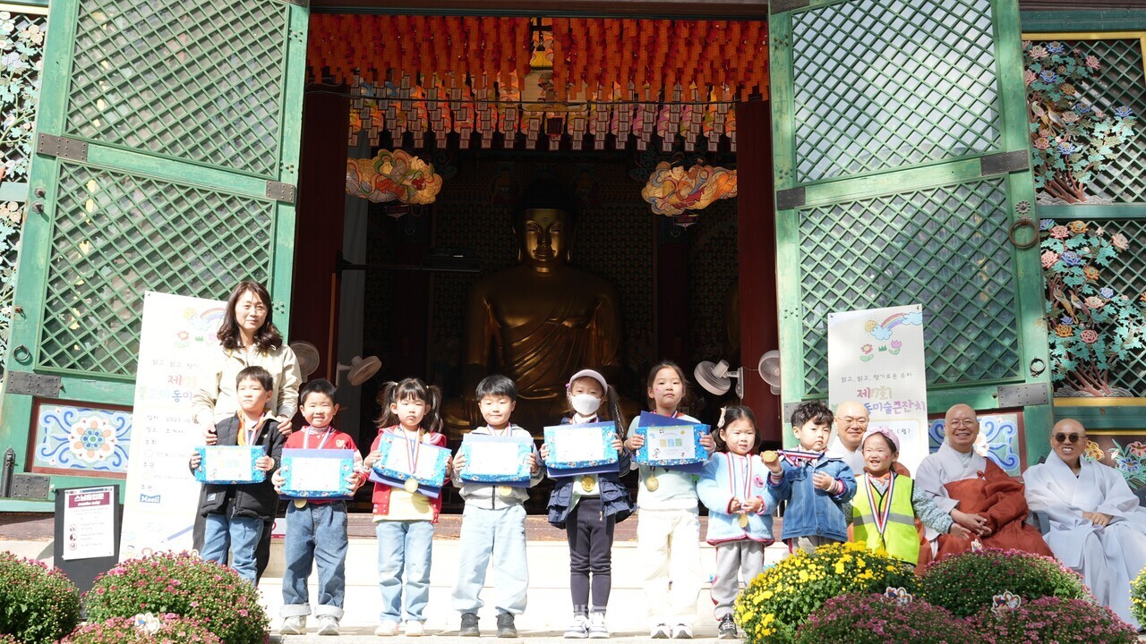 이날 미술큰잔치에는 온라인과 현장접수를 통해 900여 명의 어린이가 참가했다. ‘부처님과 함께 피는 예쁜 꽃’ ‘가을 속 행복한 우리 가족’을 주제로 아이들은 자신의 그림 실력을 뽐냈다.