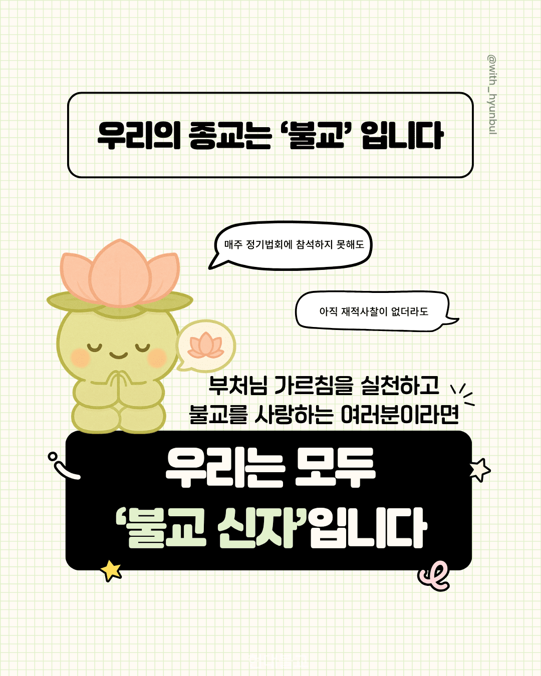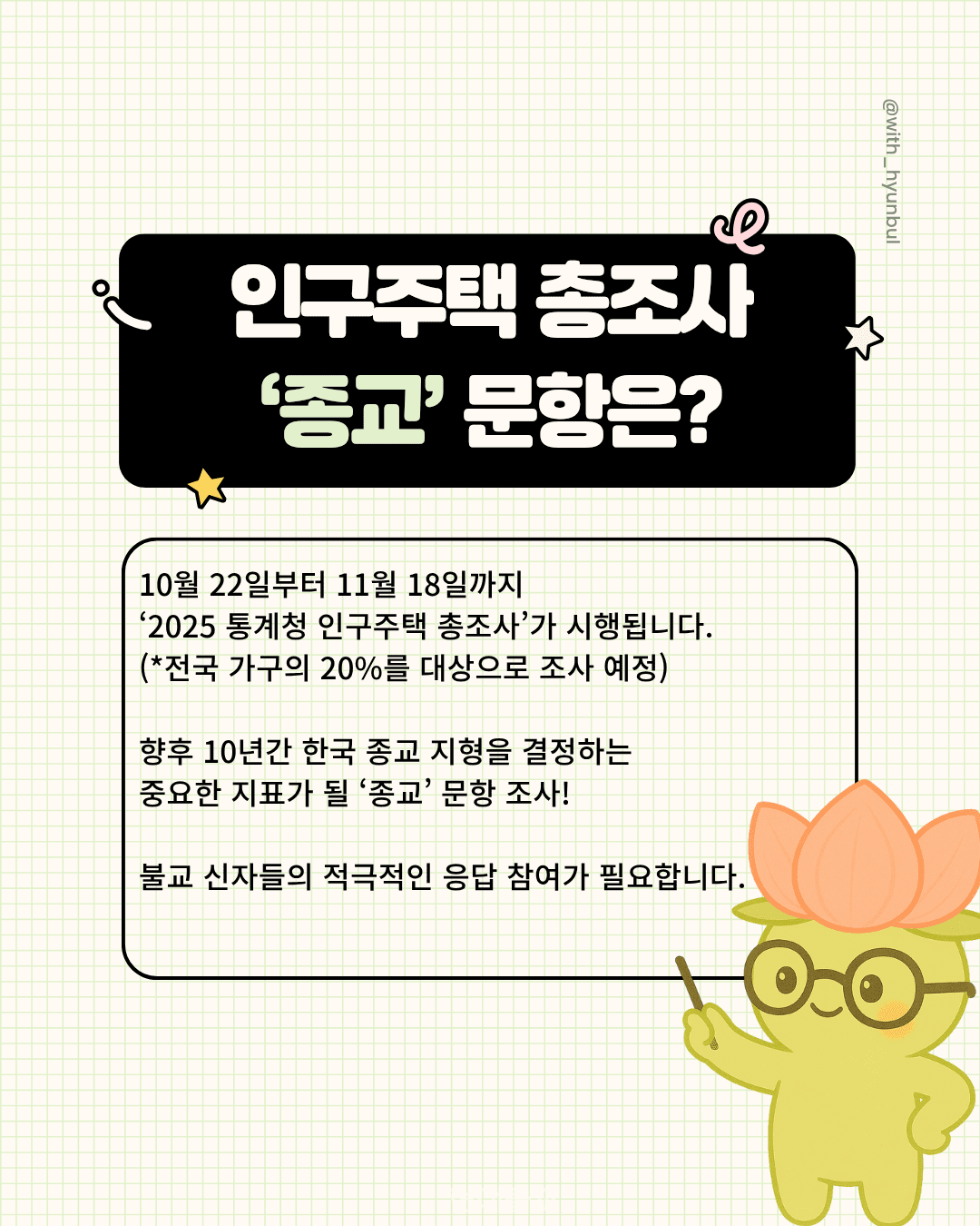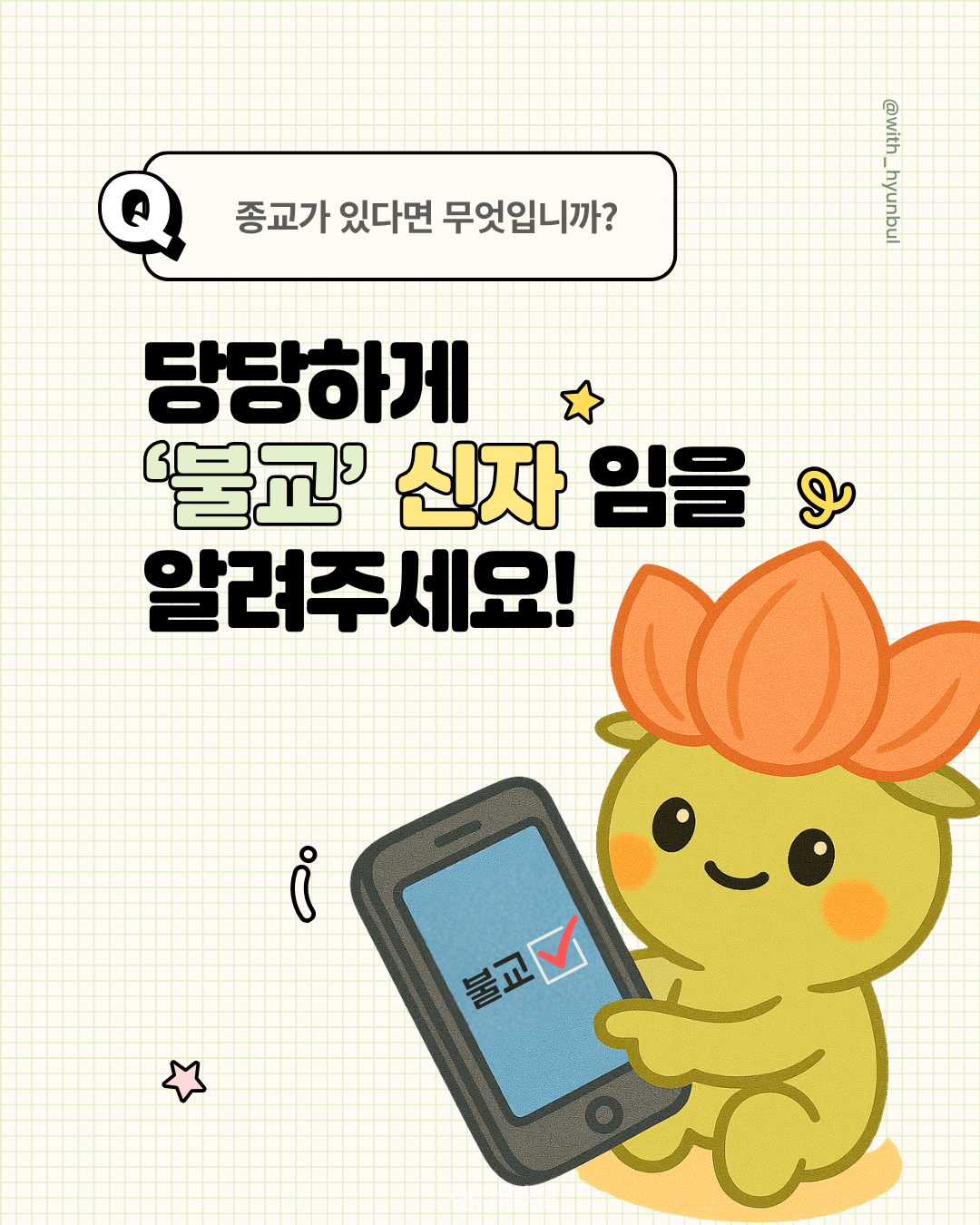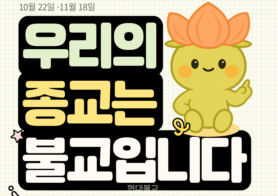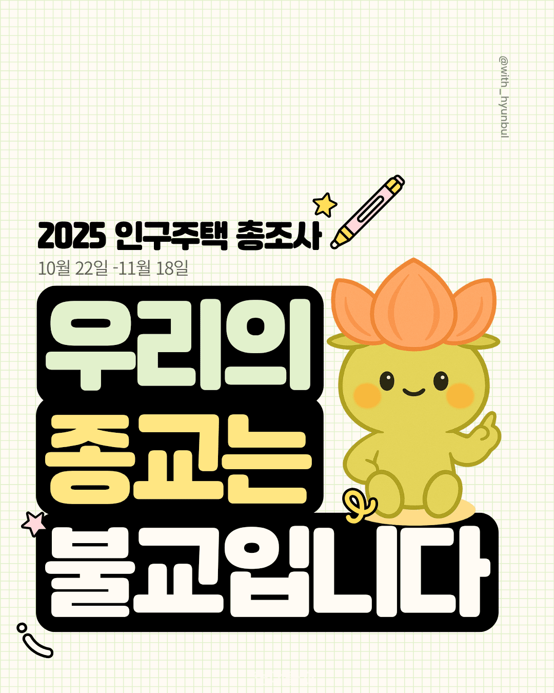 이전 기사보기 다음 기사보기 [현대불교 인구주택총조사 캠페인] '불교'로 답해요 글자크기 설정 가 가 기사의 본문 내용은 이 글자크기로 변경됩니다. 스크롤 이동 상태바 기획 [현대불교 인구주택총조사 캠페인] '불교'로 답해요 현불뉴스 업데이트 2025.10.22 13:49 입력 2025.10.21 10:08 댓글 0 2025 인구주택 총조사 우리의 종교는 '불교'입니다 관련기사 [기자칼럼] 종교 통계의 두 얼굴 인구주택총조사 앞두고 불교계 역량 ‘결집’ 현불뉴스 hyunbulnews@hyunbul.com 다른기사 보기 저작권자 © 현대불교 무단전재 및 재배포, AI학습 및 활용 금지 개의 댓글 회원로그인 작성자 비밀번호 댓글 내용입력 댓글 정렬 최신순 추천순 답글순 BEST댓글 BEST 댓글 답글과 추천수를 합산하여 자동으로 노출됩니다. 닫기 더보기 댓글삭제 삭제한 댓글은 다시 복구할 수 없습니다. 그래도 삭제하시겠습니까? 비밀번호 댓글수정 댓글 수정은 작성 후 1분내에만 가능합니다. 본문 / 400 비밀번호 내 댓글 모음 닫기