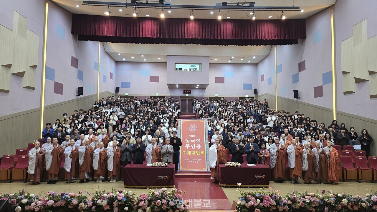 500여 동국대 학생들이 불·법·승 삼보에 귀의하며 불자로 거듭났다. 동국대(총장 윤재웅)는 11월 5일 본관 남산홀에서 ‘2025 동국인 수계대법회’를 봉행했다.