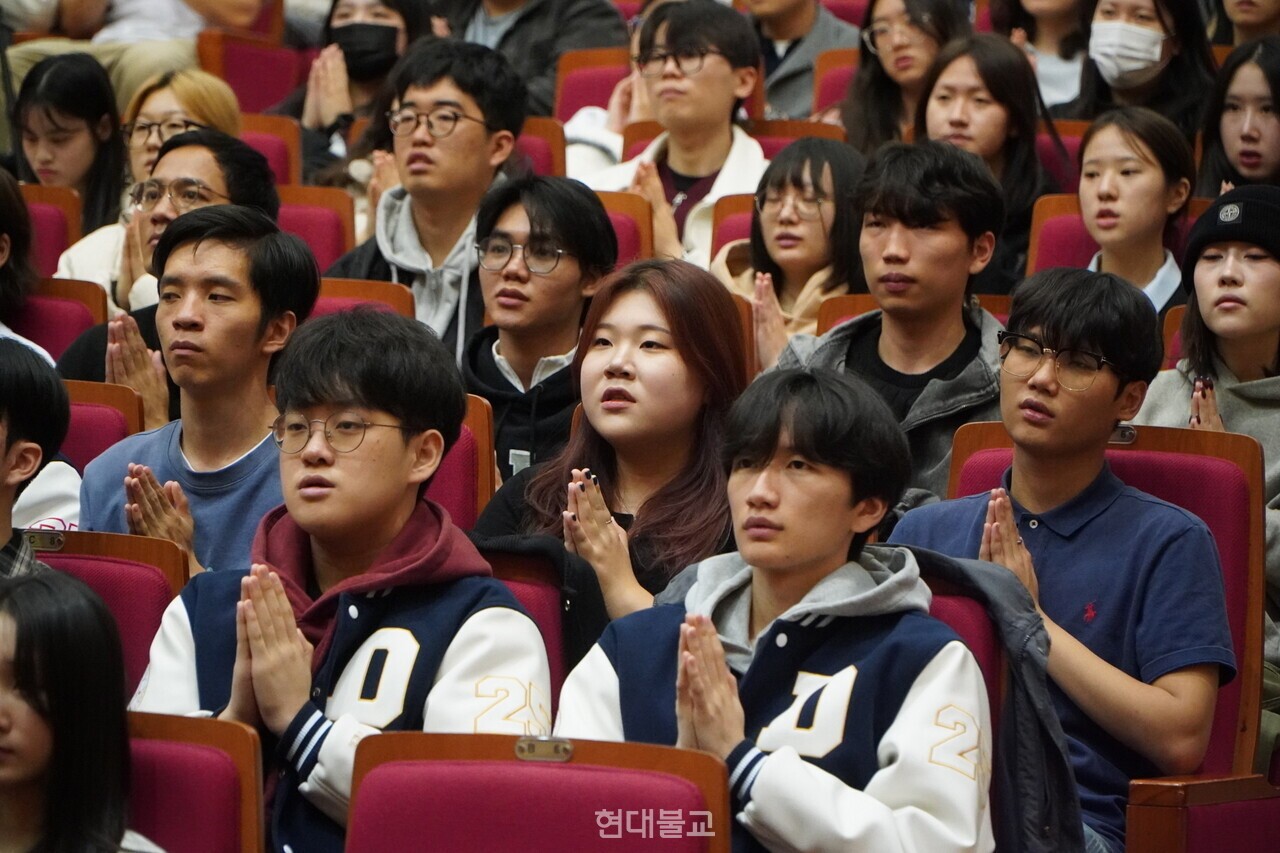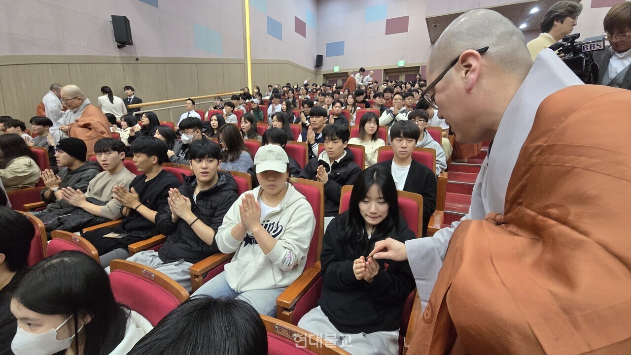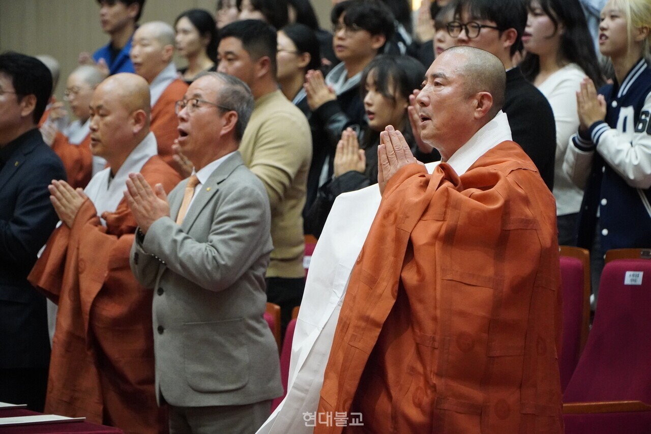 돈관 스님은 “여러 인연을 거쳐 남산홀에 모여 수계를 받는 이 자리는 동국의 자긍심을 갖고 참된 불자로서 살아가겠다고 부처님과 여러분 스스로에게 약속하는 법석”이라며 “오늘의 약속들이 어두운 밤을 밝히는 등불이 되고 고통의 바다를 건너는 뗏목이 될 것”이라고 강조했다.