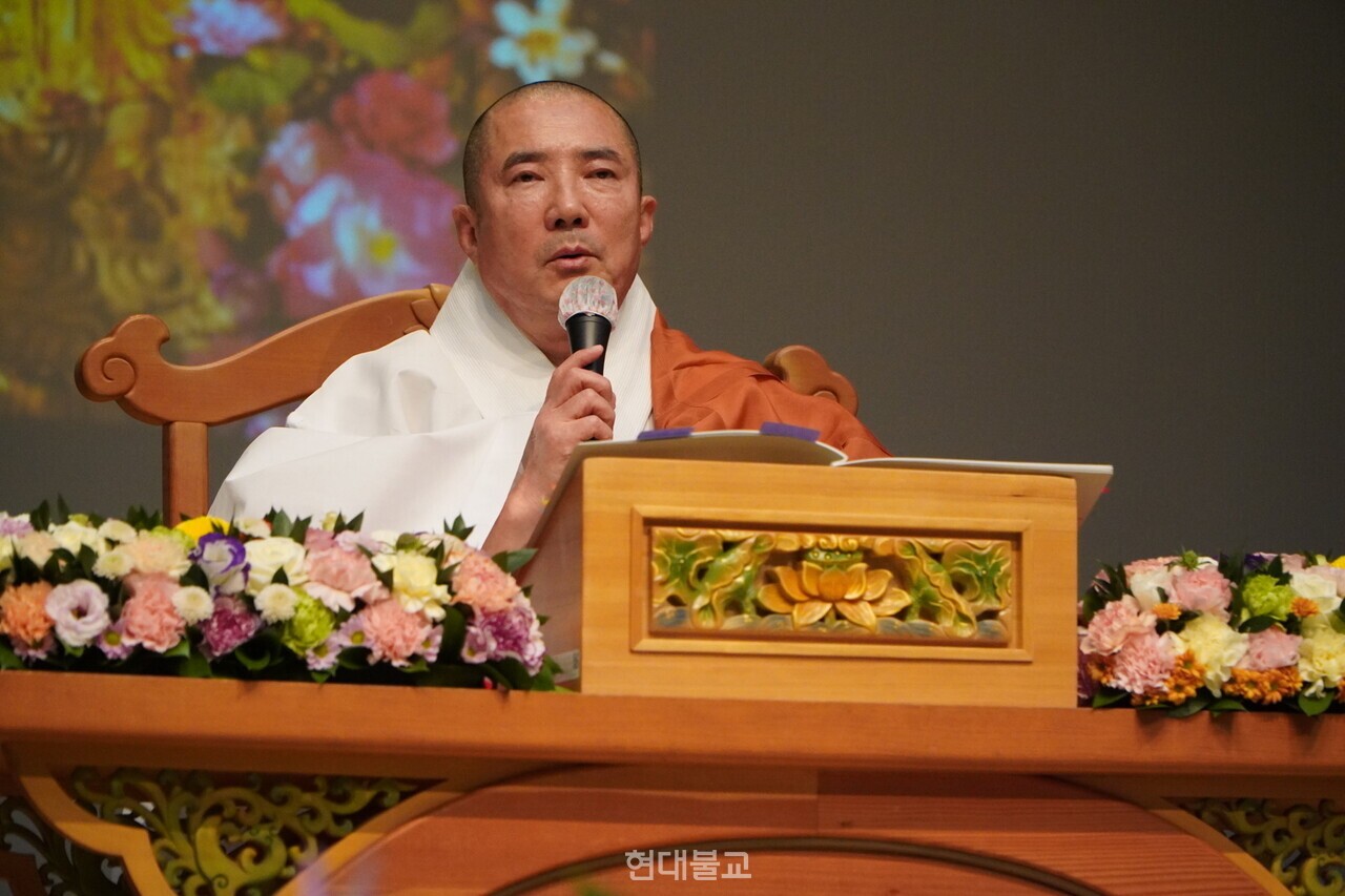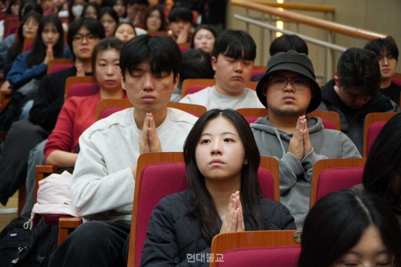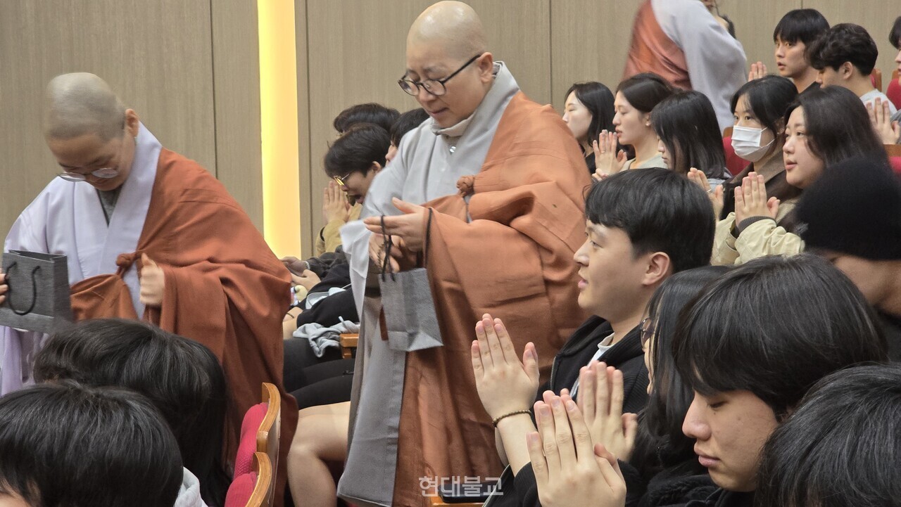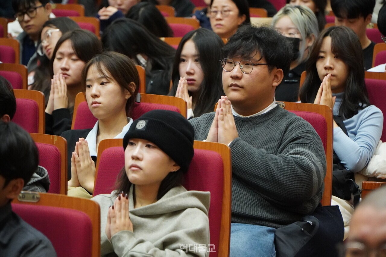 돈관 스님은 “여러 인연을 거쳐 남산홀에 모여 수계를 받는 이 자리는 동국의 자긍심을 갖고 참된 불자로서 살아가겠다고 부처님과 여러분 스스로에게 약속하는 법석”이라며 “오늘의 약속들이 어두운 밤을 밝히는 등불이 되고 고통의 바다를 건너는 뗏목이 될 것”이라고 강조했다.