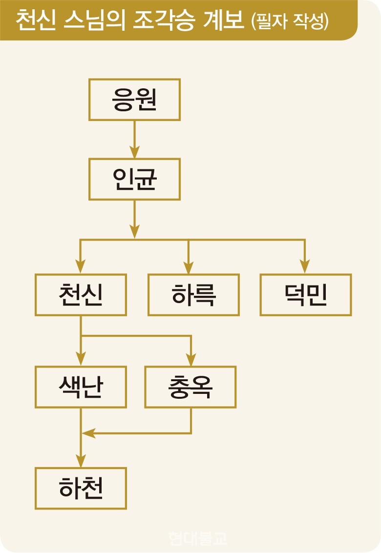 천신 스님의 조각승 계보는 응원(1613~ 1635, 이하 활동 연대)→인균(1614~1662)→천신(1654~1670)·하륵(河勒, 1654~1662)·덕민(德敏, 1659~1662)→색난(1662~1730)·충옥(忠玉, 1668~1705)→하천(夏天, 1703~1730)으로 이어진다.