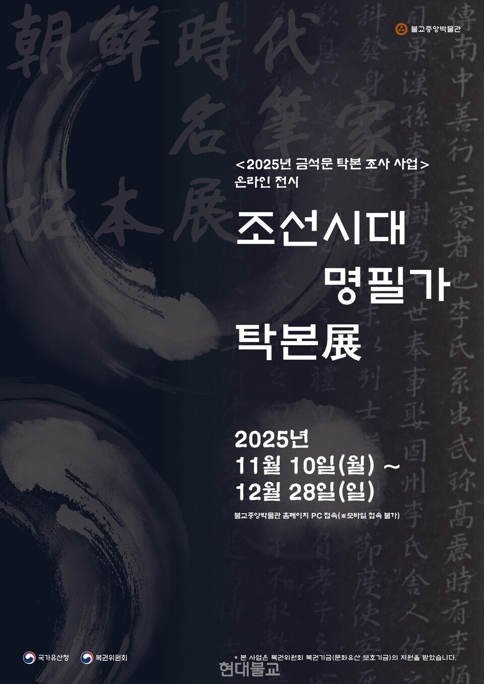 조계종 불교중앙박물관(관장 서봉 스님)은 ‘2025년 금석문 탁본 조사 사업’의 일환으로 11월 10일부터 12월 28일까지 온라인 전시 ‘조선시대 명필가 탁본’ 전시를 개최한다.