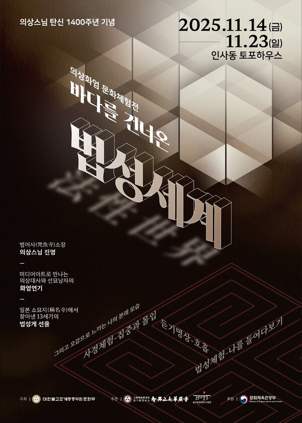 조계종 총무원 문화부(부장 성원 스님)는 “의상 스님 탄신 1400주년을 기념해 ‘의상화엄 문화체험전–바다를 건너온 법성세계’를 개최한다”고 밝혔다.