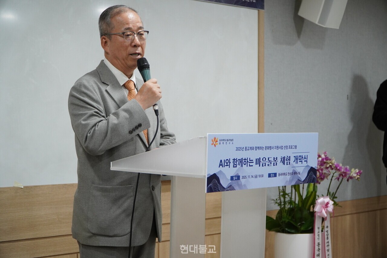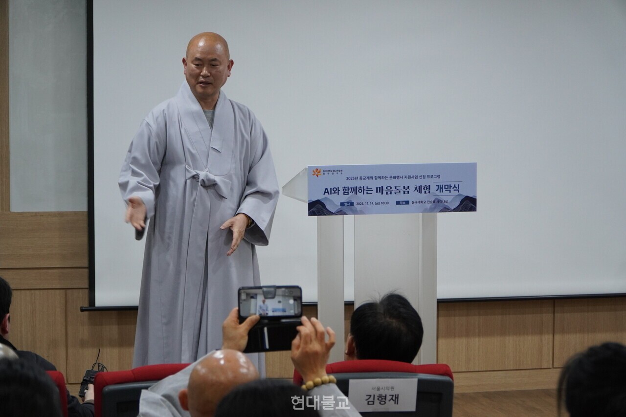앞서 열린 개막식에서 학교법인 동국대 이사장 돈관 스님은 “<원각경>에는 ‘일심이 청정하면 일신이 청정하고 일신이 청정하면 다심이 청정하고 다심이 청정하면 시방삼세가 청정하다’고 했다”면서 “세상은 살기 편해졌지만 마음은 도리어 복잡해졌다. 이런 시기에 동국대가 앞장서 AI를 활용해 마음돌봄 체험행사를 진행해 뜻깊다”고 말했다.
