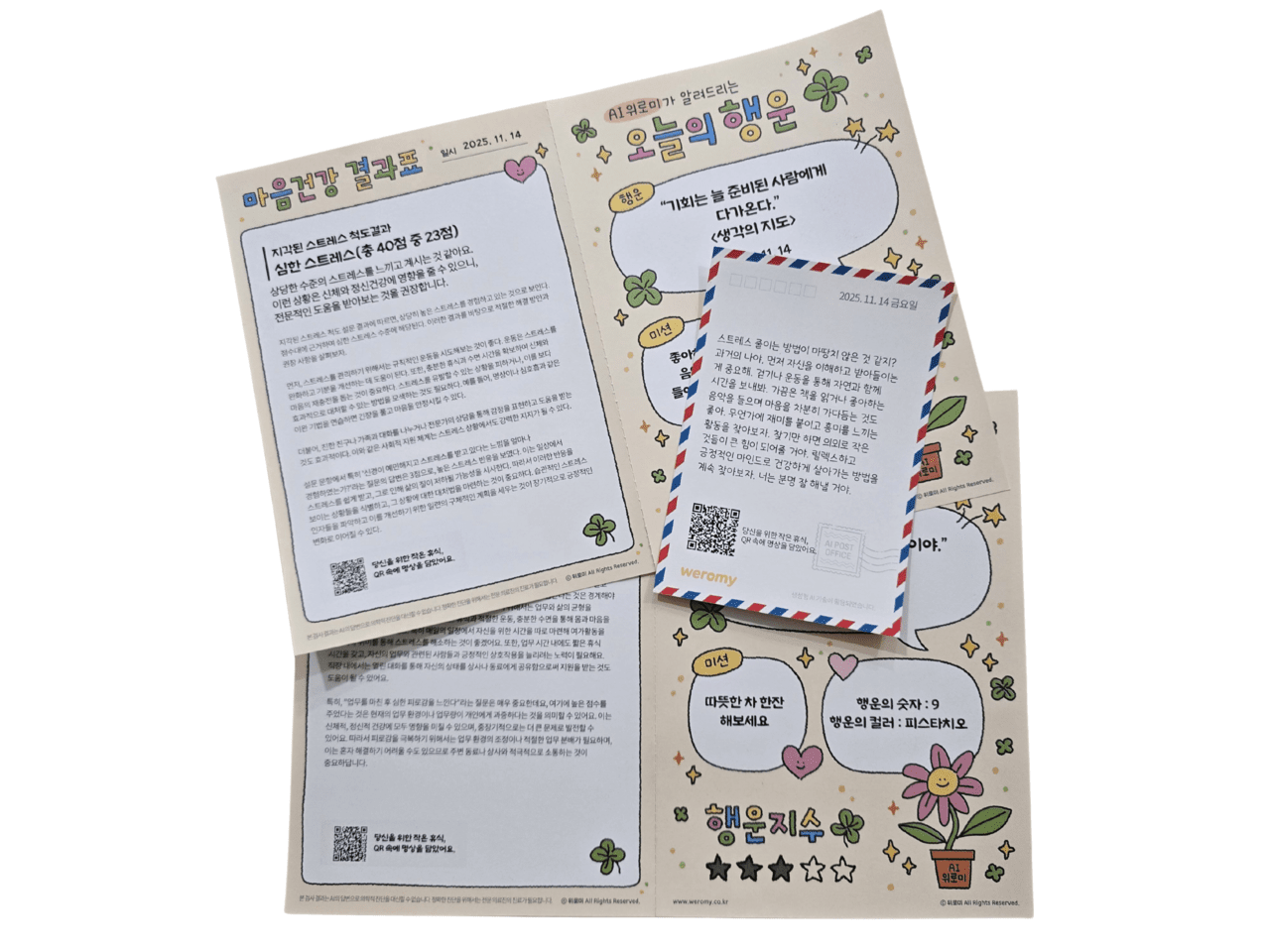 진단 결과는 현장에서 직접 프린트해 받아볼 수 있으며, 무엇보다 결과지에 있는 QR코드로 동국대 종학연구소가 개발한 '5분 명상'을 솔루션으로 제공받을 수 있다. 이는 명상에 관심이 없는 일반인에게 진입장벽을 낮출 수 있는 주요한 장치로 평가된다.