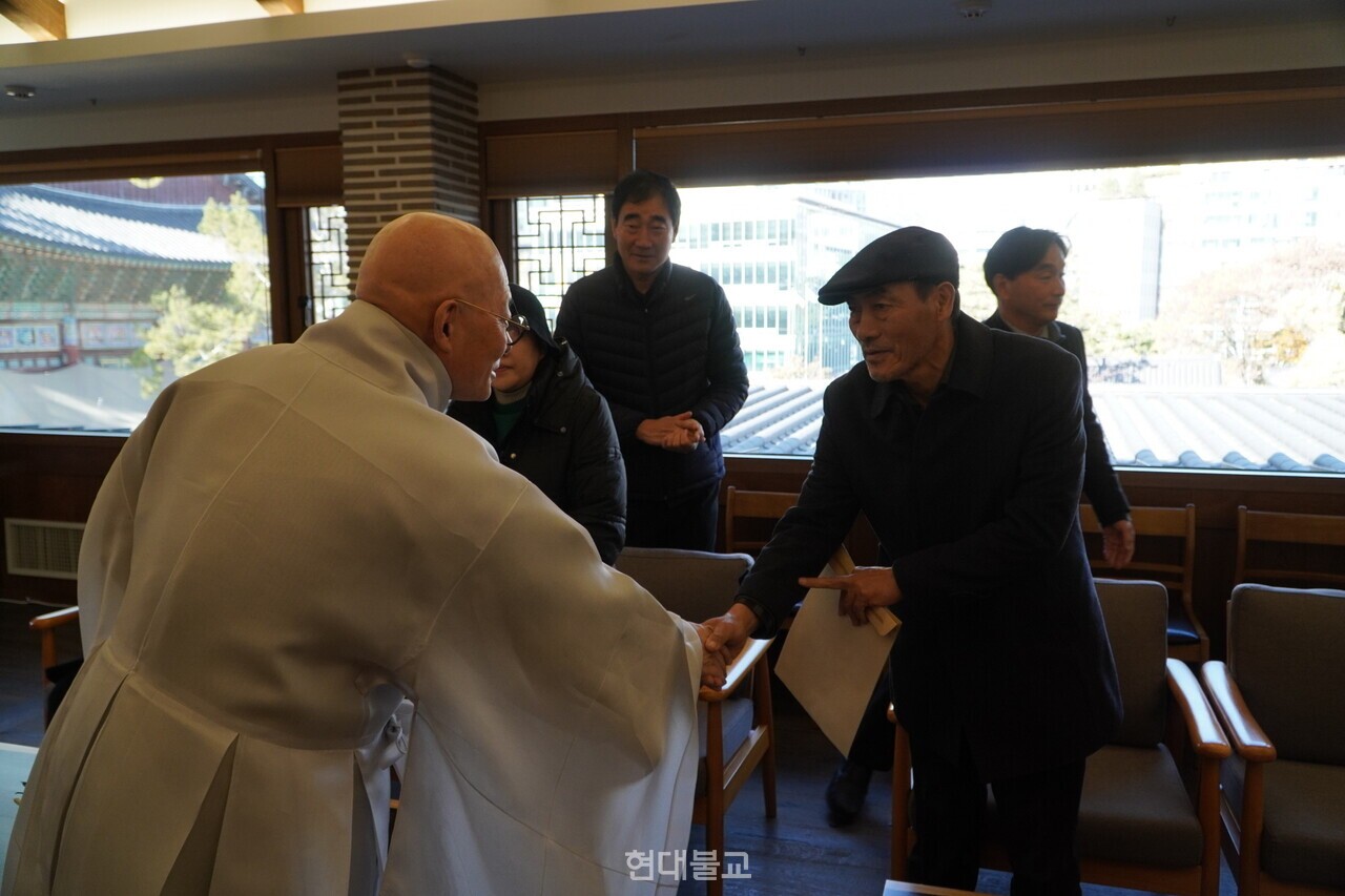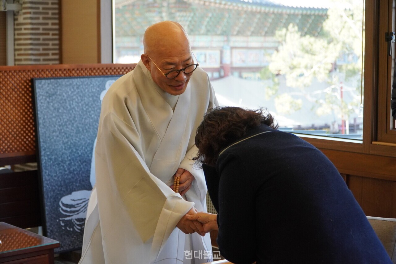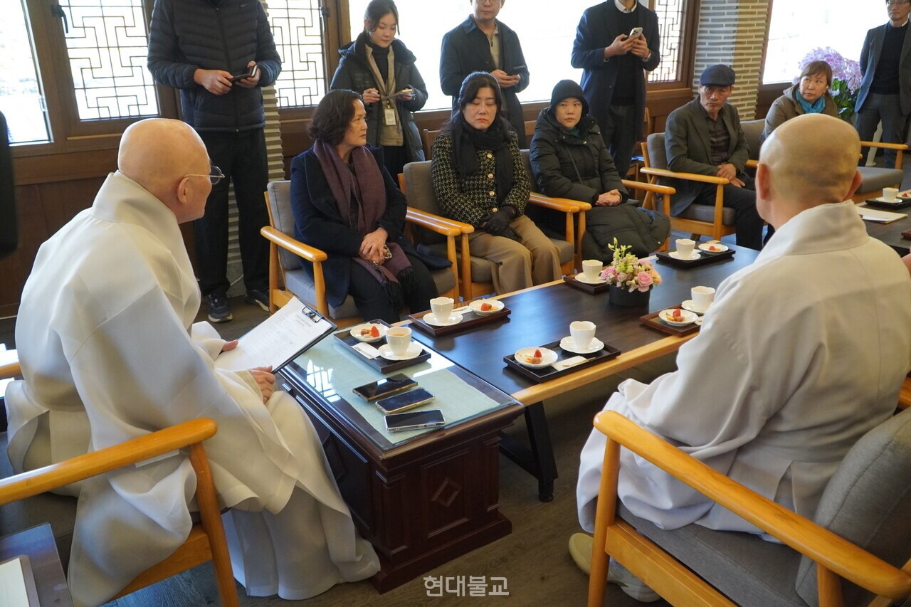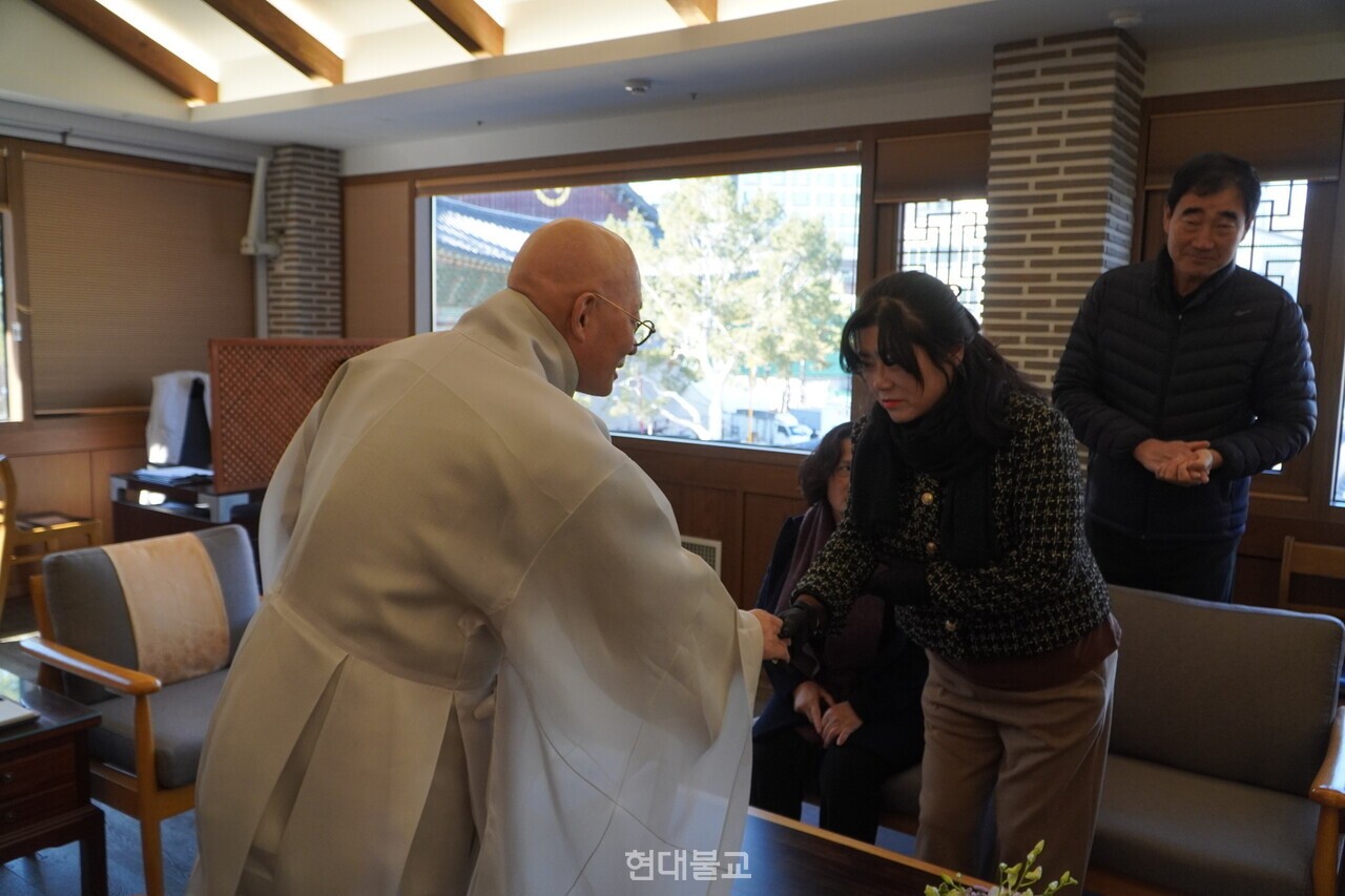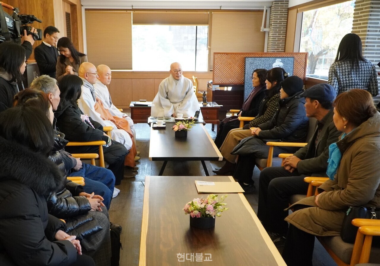 진우 스님은 11월 18일 조계사 담소 4층 접견실에서 이날 열린 '산재사망 희생자 추모 위령재'에 참석한 유가족들의 예방을 받고 차담을 가졌다.